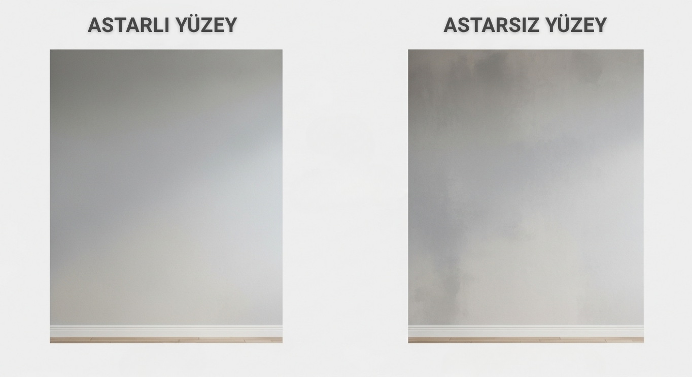 Dolgulu Yüzeyler: Silikat kalsiyum panel, alçıpan veya beton gibi yüzeylerde herhangi bir çukur dolgusu veya derz dolgusu yapıldıysa, bu bölgeler mutlaka astarlanmalıdır. Astar, dolgu malzemesi ile orjinal yüzey arasındaki su emme farkını dengeleyerek tek tip bir yüzey oluşturur.