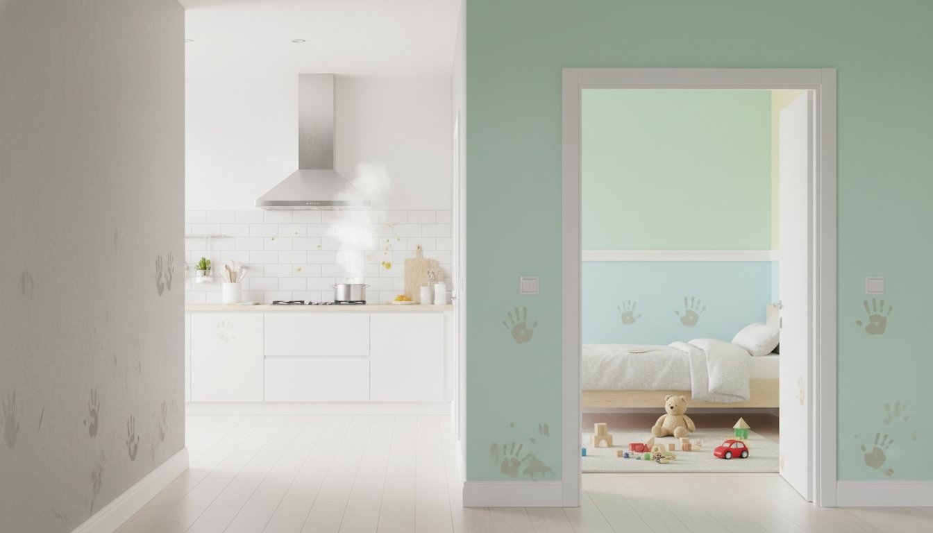 Mutfak, koridor ve çocuk odaları, evin en hareketli bölgeleridir. Sürekli temas, sürtünme ve fiziksel temas, bu alanlardaki boyaların daha çabuk kirlenmesine, aşınmasına ve matlaşmasına neden olur. Özellikle çocuk odalarında el izleri ve oyun hamuru lekeleri kaçınılmazdır. Bu gibi yoğun trafiğe sahip alanlar için silinebilir, su bazlı ve dayanıklı boyaları tercih edin. Boyanın "silinebilirlik" ve "aşınma direnci" değerlerine bakın. potasyum silikat gibi daha dayanıklı boyalar, bu alanlar için idealdir.