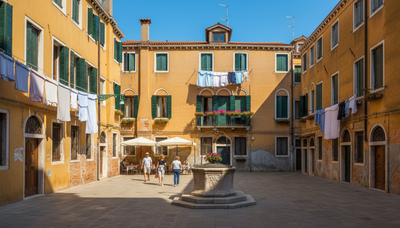 Campo ve meydanlara yayılan sarı, hardal rengi ve turuncu tonlar, Venedik'e has Akdeniz ışığını en iyi şekilde yansıtır. Bu sıcak renkler, şehrin neşeli, misafirperver ve enerjik yönünü temsil eder. Gün batımında, bu binalar adeta altın gibi parlar ve Venedik'e "Altın Şehir" yakıştırmasını son derece hak eden bir manzara yaratır. Bu renkler, yaşam alanlarını, evlerin sıcaklığını ve samimiyetini anlatır.